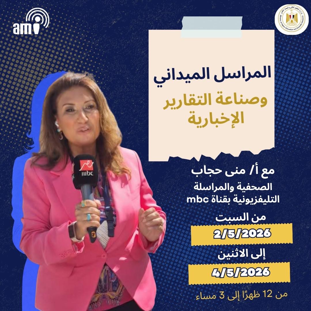 دورة تدريبية بعنوان « المراسل الميداني وصناعة التقارير الإخبارية » يحاضرها الأستاذة/ منى حجاب – الصحفية والمراسلة التليفزيوني بقناة MBC ، وذلك في الفترة من السبت ٢ مايو وحتى الاثنين ٤ مايو في تمام الساعة ١٢ ظهراً بمقر المعهد.