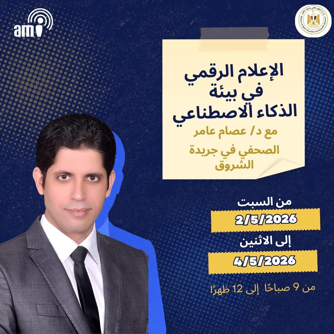 دورة تدريبية بعنوان « الإعلام الرقمي في بيئة الذكاء الاصطناعي » يحاضرها الدكتور/ عصام عامر – الصحفي في موقع الشروق ، وذلك في الفترة من السبت ٢ مايو وحتى الاثنين ٤ مايو في تمام الساعة ٩ صباحاً بمقر المعهد.