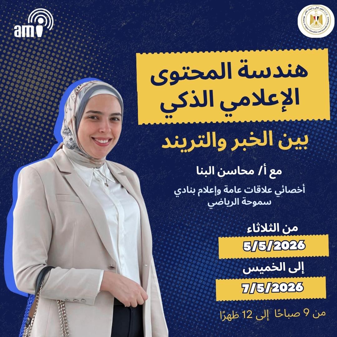 دورة تدريبية بعنوان « هندسة المحتوى الإعلامي الذكي بين الخبر والتريند » يحاضرها الأستاذة/ محاسن البنا – اخصائي علاقات عامة وإعلام بنادي سموحة الرياضي ، وذلك في الفترة من الثلاثاء ٥ مايو وحتى الخميس ٧ مايو في تمام الساعة ٩ صباحاً بمقر المعهد.