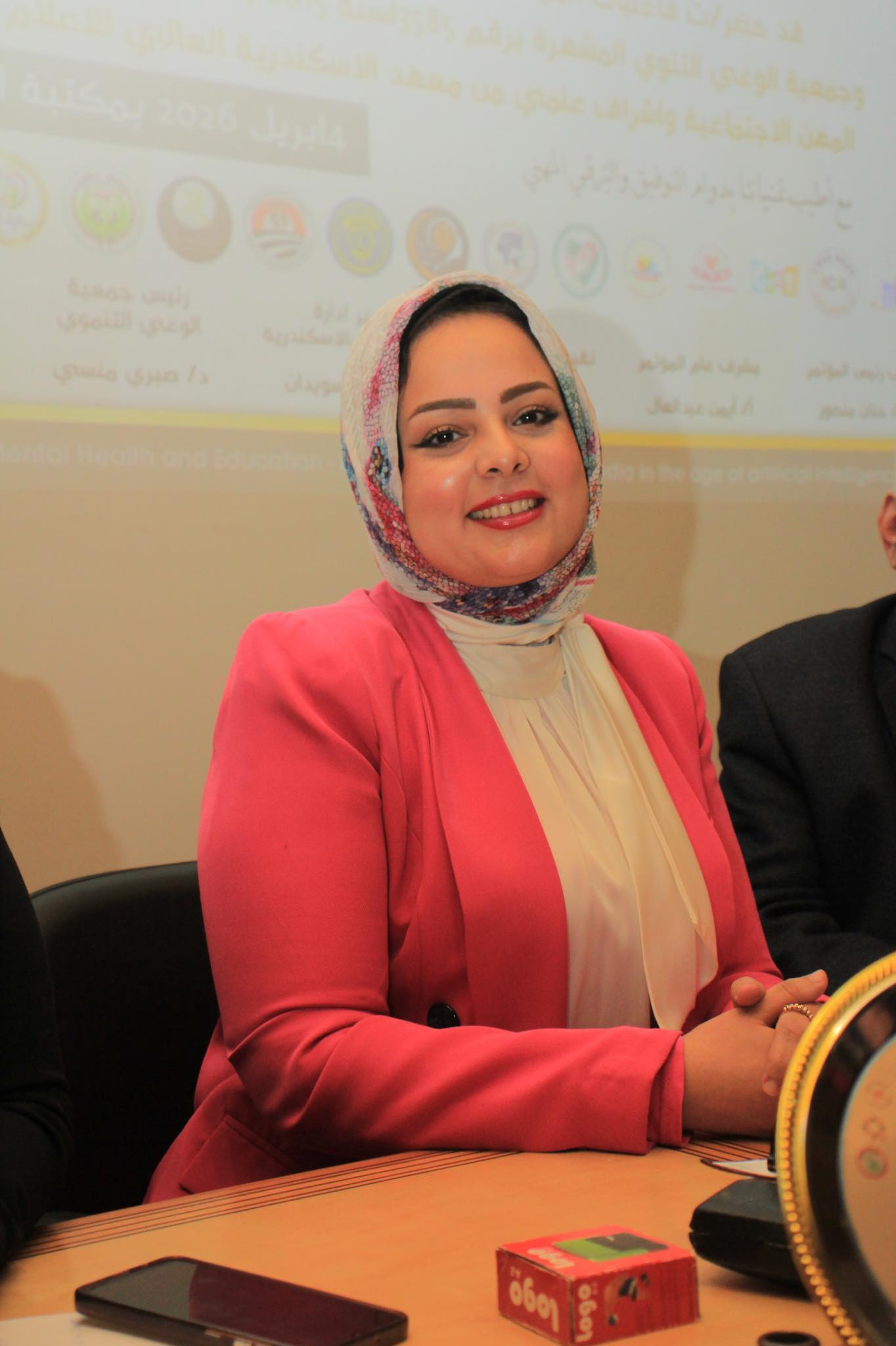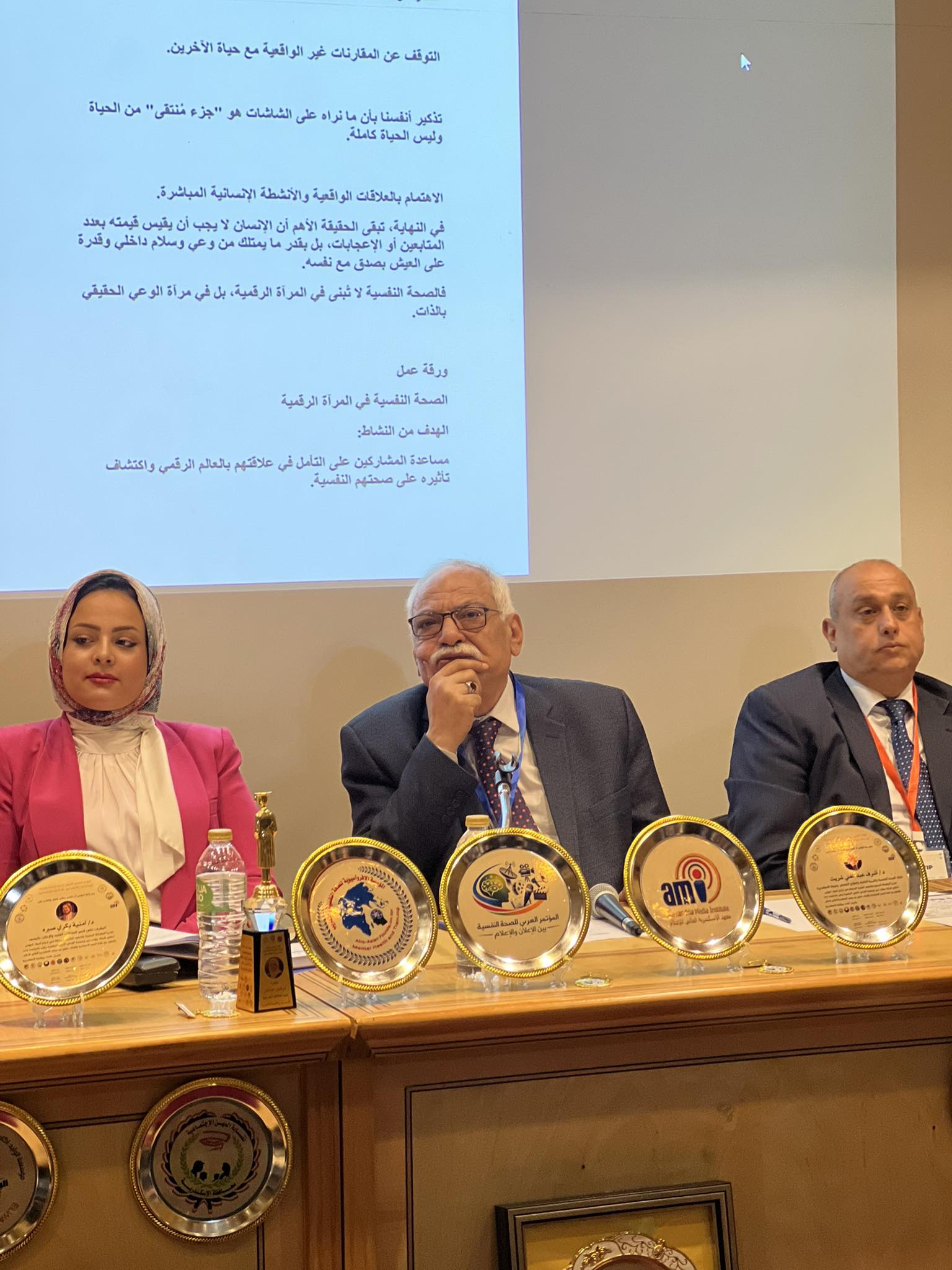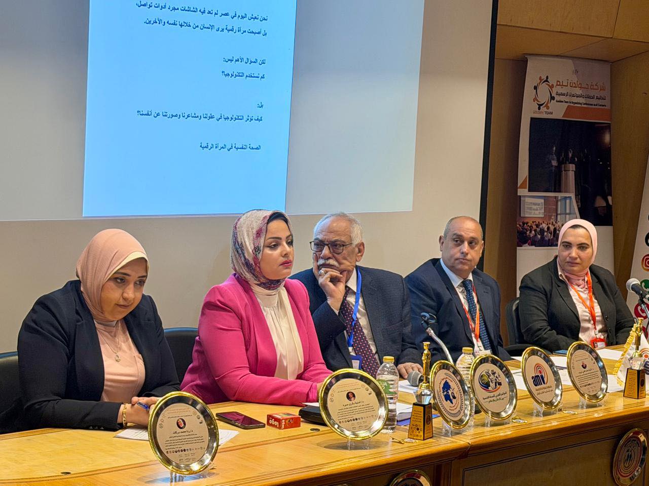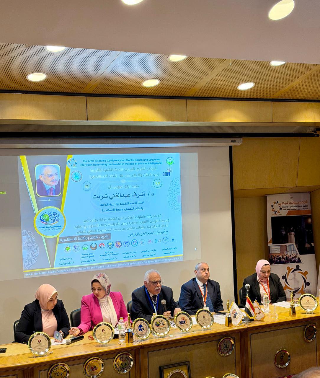 استاذ الصحه النفسيه والتربية الخاصة والعلاج النفسي جامعة الإسكندرية وحضور د. امنية بكرى المشرف على قسم العلاقات العامة والإعلان ود. رنا بركات و د. اسامه عبد الحميد ود.نرفين جابر المتحدث الرسمي للمؤتمر.