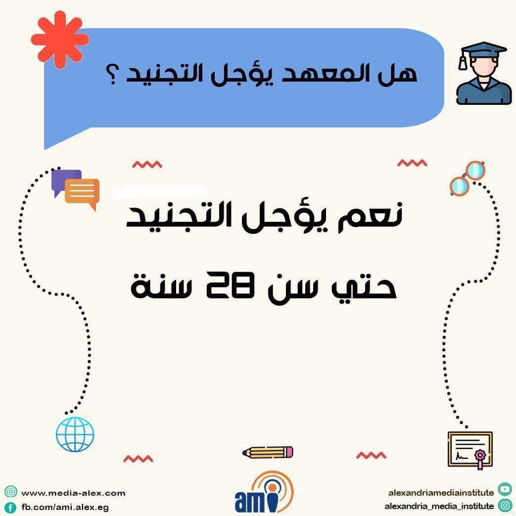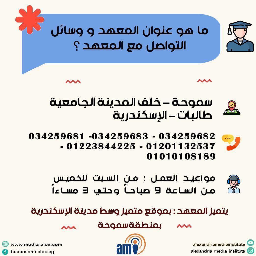 معلومات تهمك عن معهد الإسكندرية العالي للإعلام Date سبتمبر 4, 2025 لأسئلة الشائعة في فترة التقديمات لمزيد من الاستفسارات برجاء التواصل معنا عبر رسائل الصفحة Share: Nour Afifi Previous post إعلان هام بشأن دورة التربية العسكرية لطالبات دفعة 2024 سبتمبر 4, 2025 Next post إعلان هام : الآن نتيجة الفصل الصيفي ٢٠٢٤-٢٠٢٥ سبتمبر 7, 2025