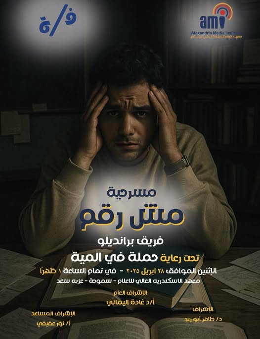 🎭 مسرحية «مش رقم» بمعهد الإسكندرية العالي للإعلام 🎭 النص: تحت رعاية الأستاذ الدكتور/ غادة اليماني عميد معهد الإسكندرية العالي للإعلام AMI، تُعقد غدًا الإثنين الموافق ٢٨ إبريل ٢٠٢٥ في تمام الساعة الواحدة ظهرًا بقاعة مؤتمرات المعهد، مسرحية بعنوان «مش …