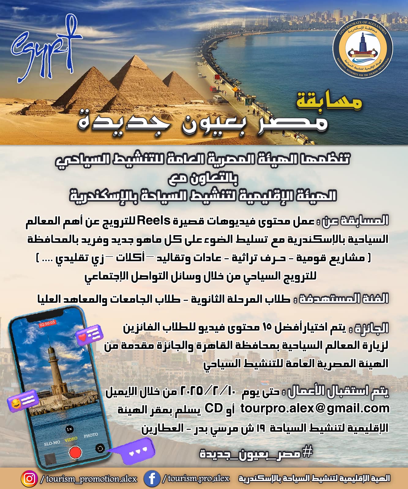 ⭕️ تحت رعاية السيد الوزير الفريق/ أحمد خالد حسن سعيد – محافظ الإسكندرية، وفي إطار التعاون المستمر بين الهيئة الإقليمية لتنشيط السياحة بالإسكندرية برئاسة السيدة الدكتورة/ إيمان شرف، والهيئة المصرية العامة للتنشيط السياحي برئاسة السيد الدكتور/ عمرو القاضي، تُعلن الهيئة …