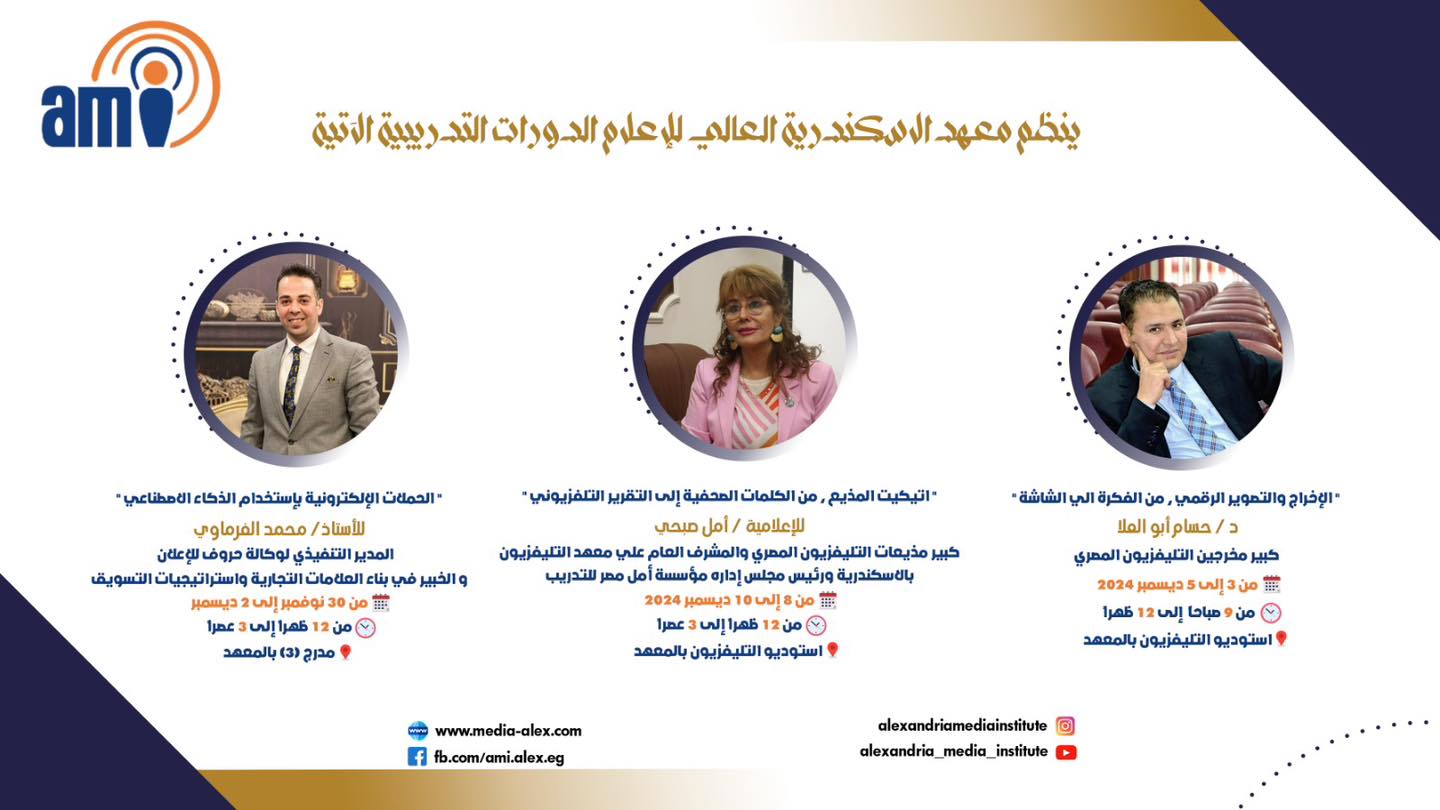 📢 يعلن معهد الإسكندرية العالي للاعلام برعاية الأستاذ الدكتور/ غادة اليماني عميد المعهد عن بدء برامج التدريب الخارجي لهذا الفصل الدراسي، وذلك بناء على بروتوكول التعاون المبرم بين المعهد و مركز التدريب والتطوير بمدينة الإنتاج الإعلامي. 1️⃣ دورة تدريبية بعنوان …