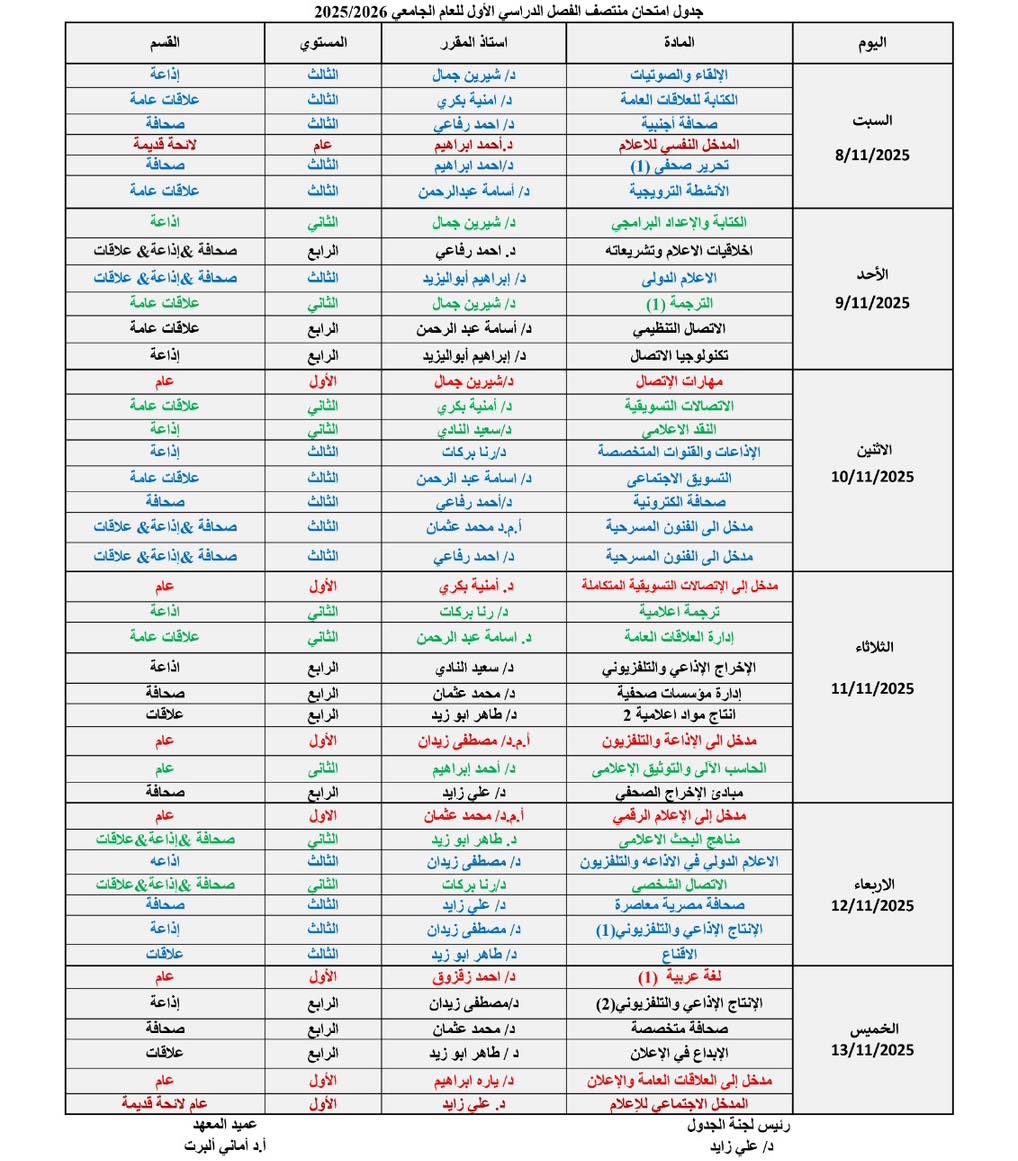 استكمالاً للمنشور السابق الخاص بـ امتحانات منتصف الفصل الدراسي الأول من العام الدراسي ٢٠٢٥-٢٠٢٦ (Midterms)، والتي تبدأ يوم السبت ٨-١١-٢٠٢٥ وتنتهي يوم الخميس ١٣-١١-٢٠٢٥،إليكم مواعيد اللجان الامتحانية وكشوف توزيع الطلاب على اللجان: 🚨 على جميع الطلاب مراجعة أسمائهم في كشوف …