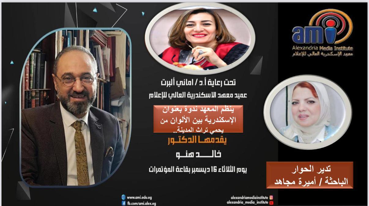 ينظم معهد الإسكندرية العالي للإعلام (AMI)، تحت رعاية الأستاذة الدكتورة/ أماني ألبرت – عميدة المعهد، ندوة بعنوان: “الإسكندرية بين الألوان… كيف يحمي الإعلام والفن تراث المدينة؟” برفقة فنان الإسكندرية الدكتور/ خالد هنو، وذلك يوم الثلاثاء الموافق ١٦ ديسمبر ٢٠٢٥ الساعة …