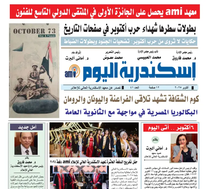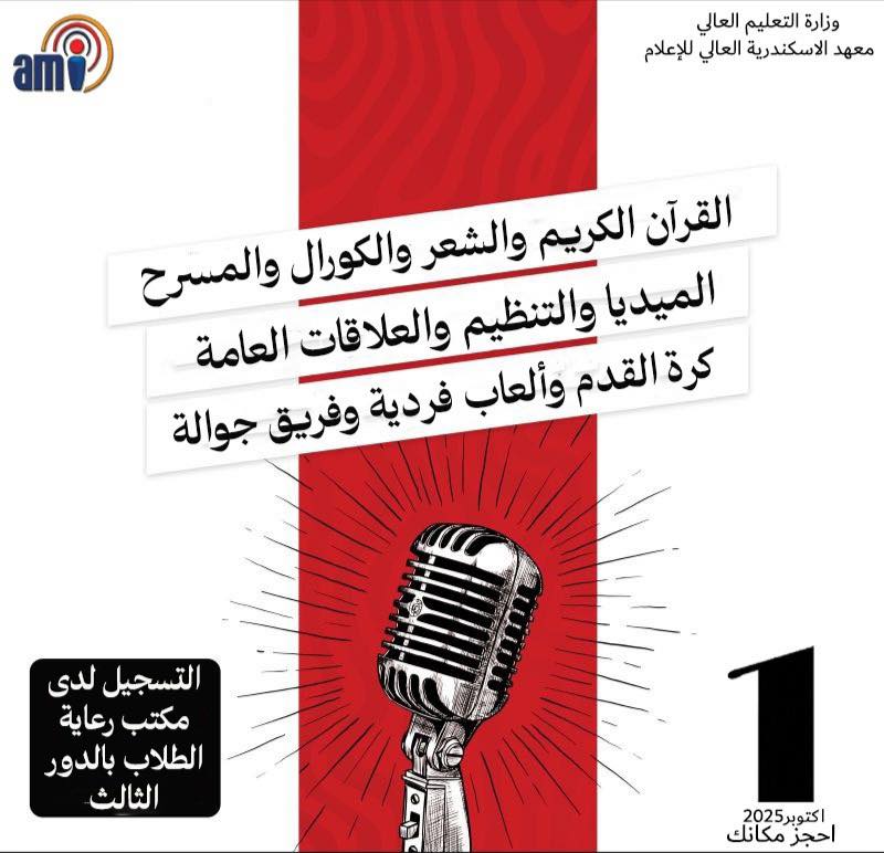 تعلن إدارة رعاية الطلاب بمعهد الاسكندرية العالي للإعلام ami عن فتح باب الاشتراك في الأنشطة الطلابية للعام الدراسي ٢٠٢٥-٢٠٢٦ وذلك في المجالات الآتية: (القرآن الكريم – الإنشاد – الشعر – الكورال – stand up كوميدي – تنظيم ومراسم – media …